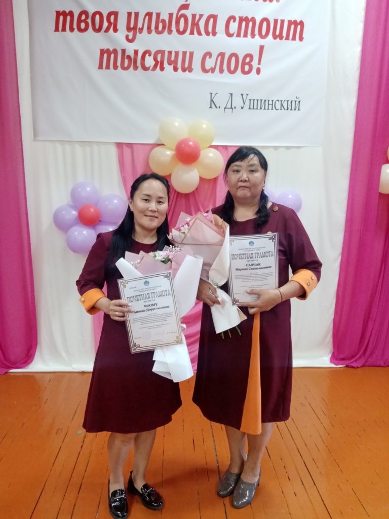 Приятной частью августовского совещания стала церемония вручения грамот и благодарностей работникам образования. Почетными грамотами Министерства образования Республики Тыва награждены наши педагоги Салчак Марина Семис-ооловна и Чоома Айлана Доруг-ооловна.