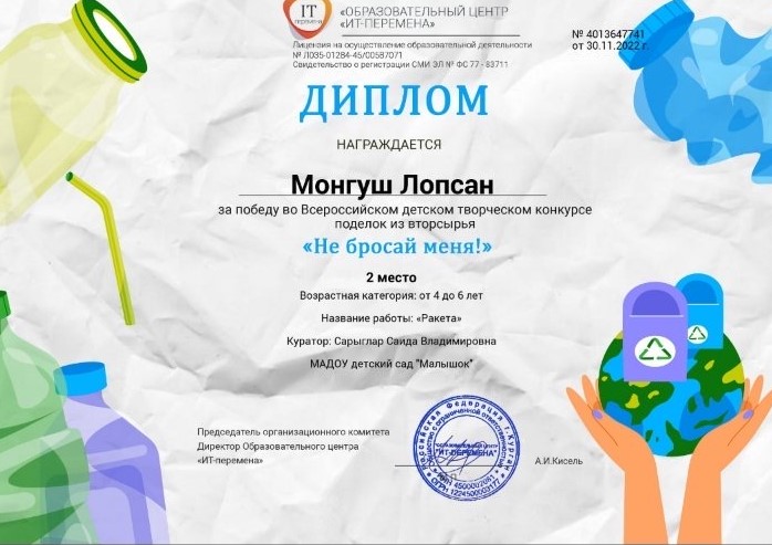 По итогам участия во Всероссийском конкурсе все наши воспитаннники: Лопсан Аян-Херел, Монгуш Лопсан, Сере Долаан,Оюн Севил, Ондар Александра заняли 2 место и награждены дипломами. Воспитатель Сарыглар Саида Владимировна получила благодарственное письмо за подготовку воспитанников к участию в Конкурсе.