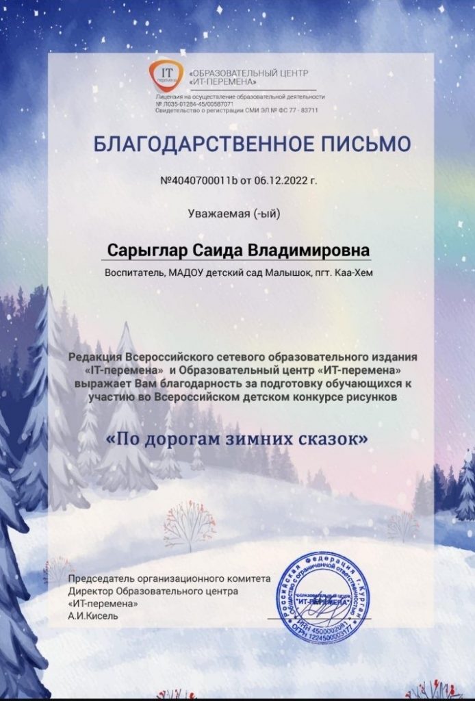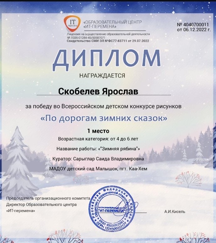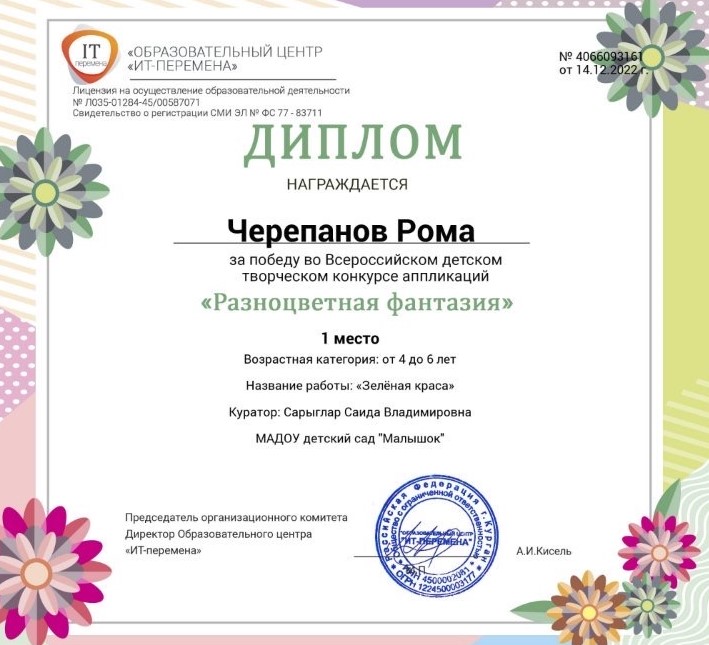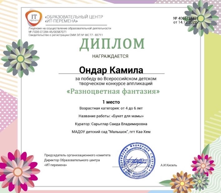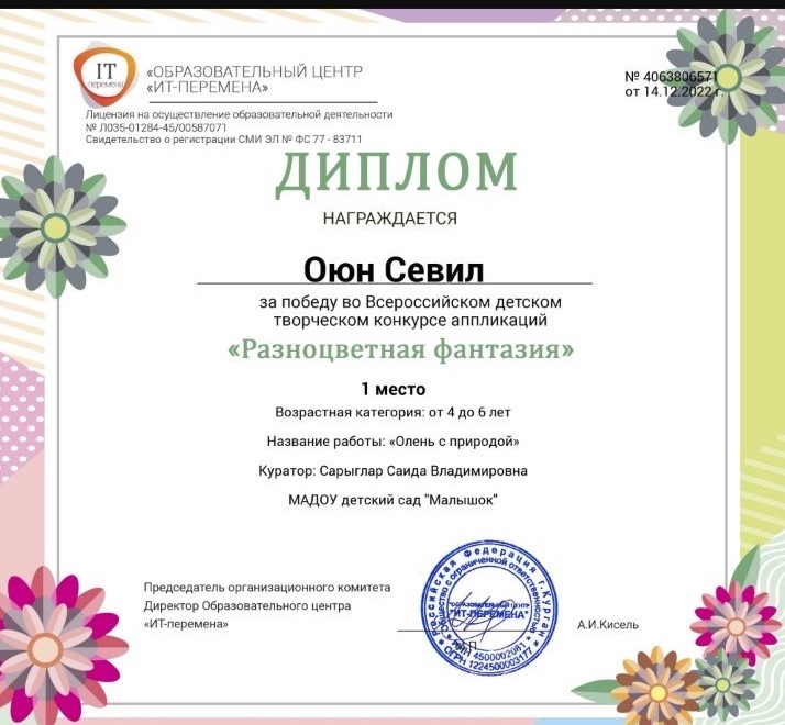 Во Всероссийском детском конкурсе аппликаций «Разноцветная фантазия» в числе победителей воспитанники группы «Пчелки» Егоренко Егор, Монгуш Даниела, Петчик Софья, Черепанов Роман, Ондар Сайзана. Из этой же группы Ондар Александра заняла 1 место во Всероссийском детском конкурсе работ из пластилина «Герои Нового года». За подготовку воспитанников во Всероссийских конкурсах награждена Благодарностью воспитатель группы «Пчелки» Сарыглар Саида Владимировна.