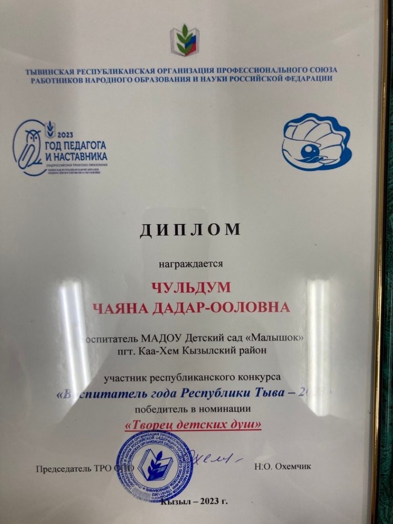 Кызылский кожуун в этом конкурсе достойно защищала наш педагог-воспитатель Чаяна Чулдум, которая успешно прошла все испытания в составе десятки лучших участников конкурса. Она победила в номинации «Творец детских душ».