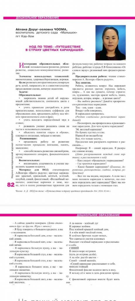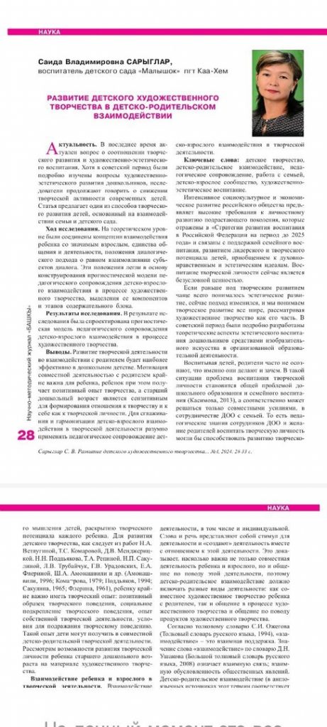 Наши педагоги активно публикуют свои авторские учебно-методические материалы на страницах педагогических изданий. Так, воспитатель средней группы «Звездочки» Саида Сарыглар и Айлана Чоома, воспитатель подготовительной группы и руководитель физического воспитания опубликовали свои авторские статьи в научно-методическом журнале для учителей «Башкы- Учитель», № 4, 2024 г.